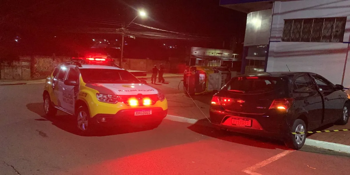 Viatura da Polícia Militar tomba após colisão com Ônix no bairro Neva em Cascavel