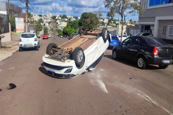 Na tarde desta sexta-feira (06) um carro acabou capotando após uma forte colisão de trânsito no Centro de Cascavel.