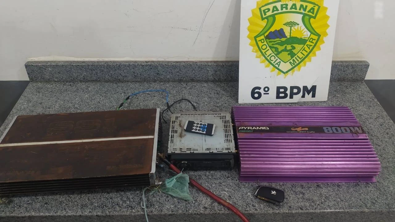 Realizada a abordagem, identificado o indivíduo de 38 anos, de posse de dois módulos de som, um aparelho de som da marca Pioneer e uma chave canivete da marca Peugeot.