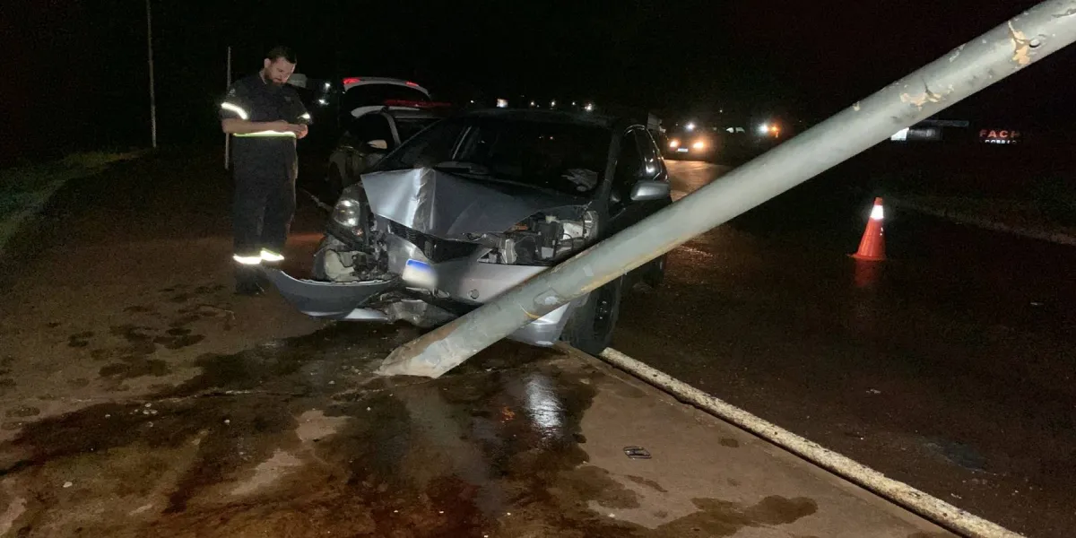 Carro colide em placa de sinalização no Bairro Pacaembu, em Cascavel