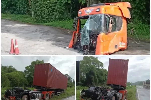 Ao desviar ele colidiu na traseira de outro caminhão e saiu da pista. Devido o impacto, a cabine do veículo soltou, e foi arremessada por alguns metros.
