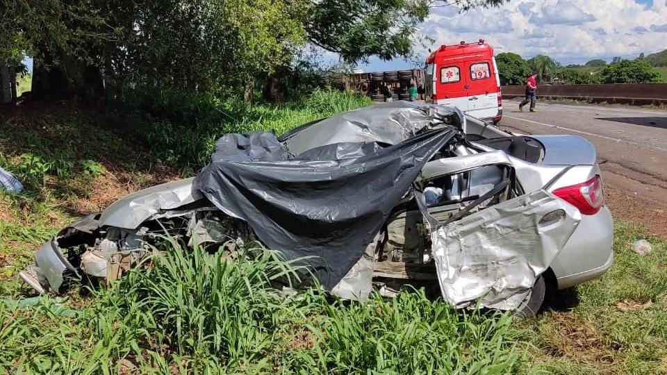 A colisão envolveu uma carreta carregada de soja e um veículo Logan de Passo Fundo - RS que seguia sentido Cascavel.