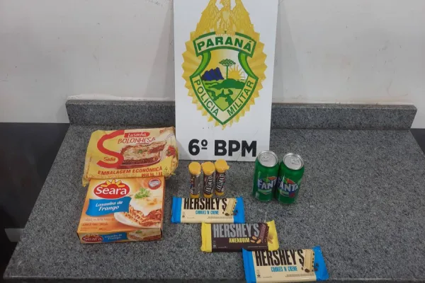 Furtados 2 Lasanhas, 3 barras de chocolate, 2 latas de refrigerante e 3 doces. Os menores e os alimentos foram encaminhados a Delegacia de Polícia para as devidas providências.