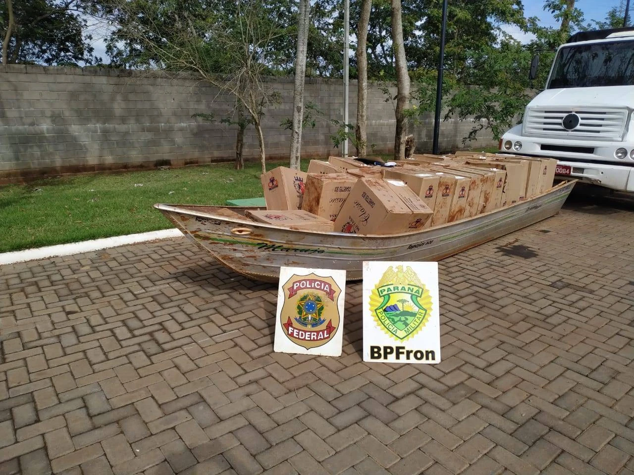 No local foram apreendidos 01 embarcação artesanal de alumínio equipada com motor Mercury 25hp, 01 veículos GM/VECTRA azul carregados com aproximadamente 25.000 maços de cigarros contrabandeados do Paraguai, prejuízo de aproximadamente R$ 150.000,00 (cento e cinquenta mil reais) ao crime organizado da região