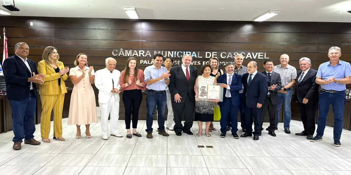 O deputado Marcio Pacheco (Republicanos) participou na tarde desta quinta-feira (09) da entrega do título de Cidadã Honorária de Cascavel à Doutora Hi Kyung Ann. A cerimônia ocorreu no Plenário da Câmara de Vereadores de Cascavel.