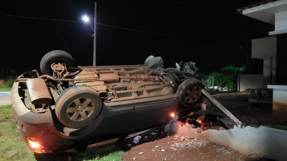Homem capota carro e para em muro de residência em Nova Santa Rosa