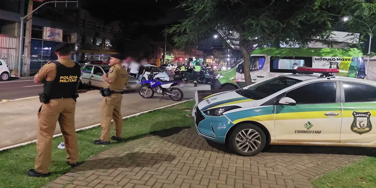 Operação integrada de fiscalização de trânsito e segurança entre a Transitar, Polícia Militar e Guarda Municipal, aconteceu na madrugada deste domingo, das 00h20 até às 06h00, no cruzamento da Avenida Brasil com a Rua Pio XII, onde concentram-se vários bares na região Central de Cascavel.