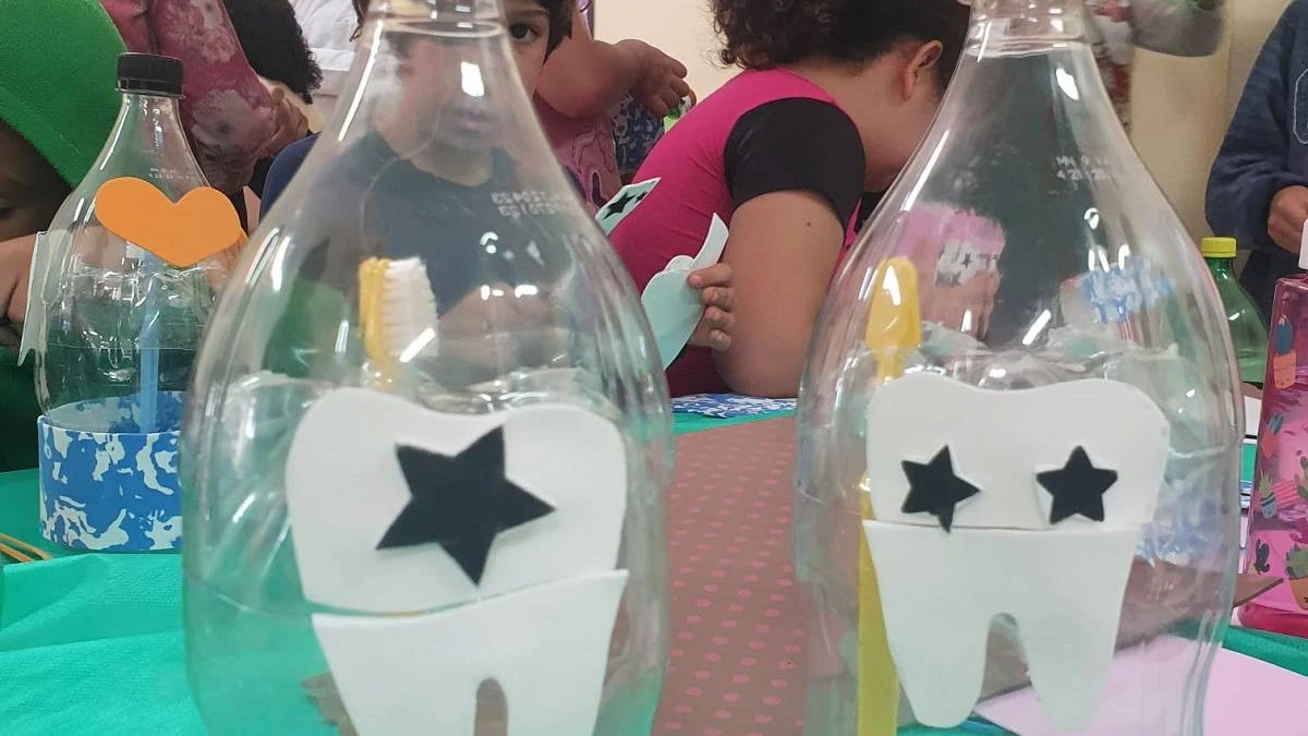 Na sexta-feira, a equipe do projeto recebeu o dentista Dr. Eduardo Deon Fortunato e a auxiliar Fabiane Novaes dos Santos para tratar da temática Saúde Bucal. As crianças assistiram a vídeos educativos e participaram de uma roda de conversa sobre o assunto. Além disso, tiveram a oportunidade de confeccionar seu próprio porta-escovas personalizado, utilizando garrafas PET recicladas, o que também serviu para ensiná-las a importância de cuidar do meio ambiente.