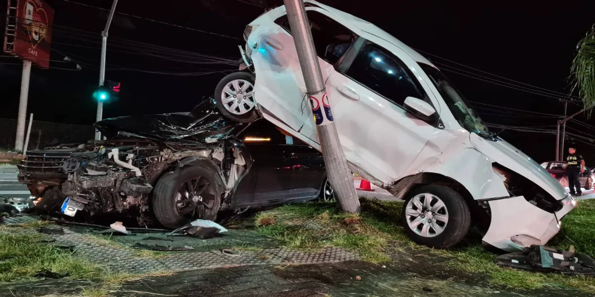 Após colisão, carro fica escorado em semáforo em cima de outro veículo