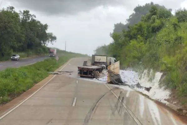 Caminhão tomba e perde carga de calcário na BR 163 em Santa Lúcia