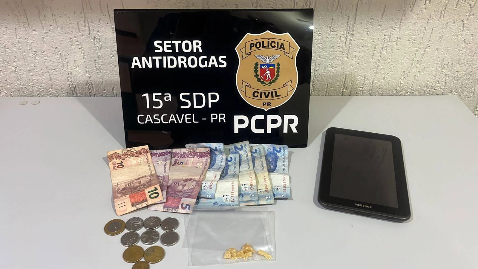 Ao ser abordada, a mulher resistiu com chutes e desacatou a equipe policial. No local, foram localizadas porções de crack que renderiam cerca de vinte pedras menores para venda, além de quantia em dinheiro e um tablet.