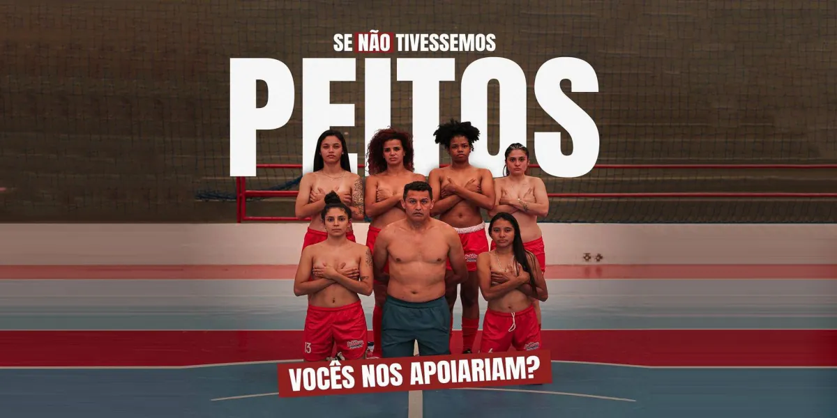 A foto mostra seis atletas da equipe sem camisa, apenas com o calção do time, no meio da quadra do Ginásio de Esportes Lagoão, onde disputaram a Série Prata de 2022 e ganharam a final, se consagrando campeãs. A frase faz um questionamento sobre a falta de apoio: “Se não tivéssemos peitos, vocês nos apoiariam?”.