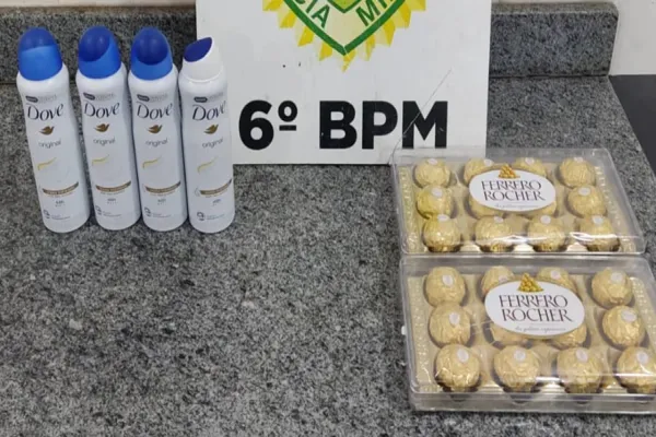 Ao chegar ao local, a equipe PM foi informada que o autor do furto havia sido perseguido pelos populares e que estavam aguardando a chegada dos policiais. O suspeito, um homem de 26 anos, foi abordado e em sua posse foi encontrada uma mochila contendo duas caixas de chocolate marca Ferrero Roche e quatro desodorantes marca Dove.