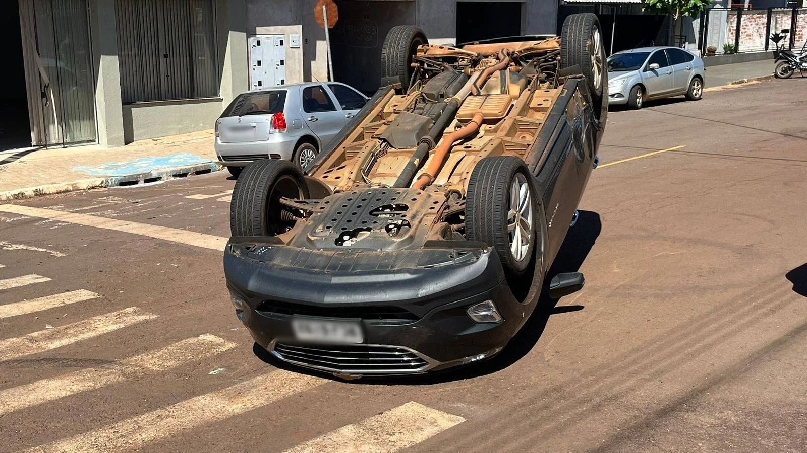 Carro capota após forte colisão na Avenida Santa Catarina em Corbélia
