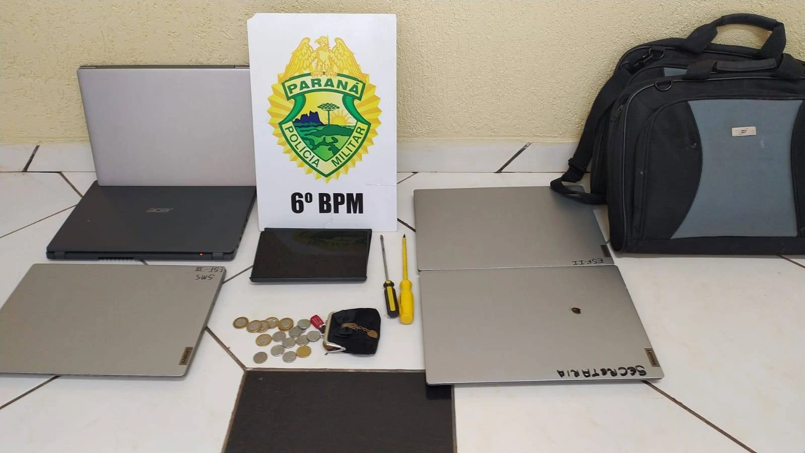 Durante as diligências, a equipe identificou e abordou o suspeito, que estava de posse de uma pochete com dinheiro. Além disso, os policiais encontraram duas sacolas com cinco notebooks e um tablet com a numeração do patrimônio da Secretaria de Saúde, que foram recuperados.