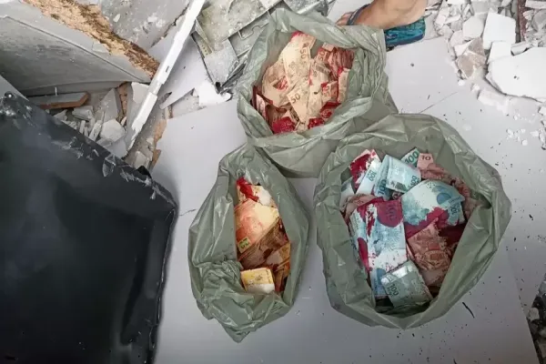 Os criminosos explodiram um dos caixas eletrônicos e levaram envelopes que estavam no equipamento. Não há informações precisas sobre o valor roubado. A polícia alerta para que as pessoas não aceitem notas manchadas.