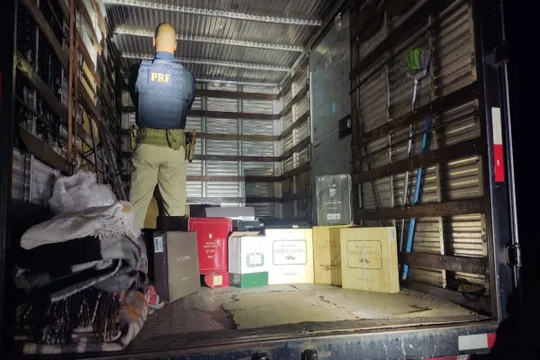 Dessa forma, iniciou-se a fiscalização ao veículo, e, ao inspecionar o compartimento de carga, foram encontradas várias caixas contendo diversas garrafas de vinho de procedência estrangeira.