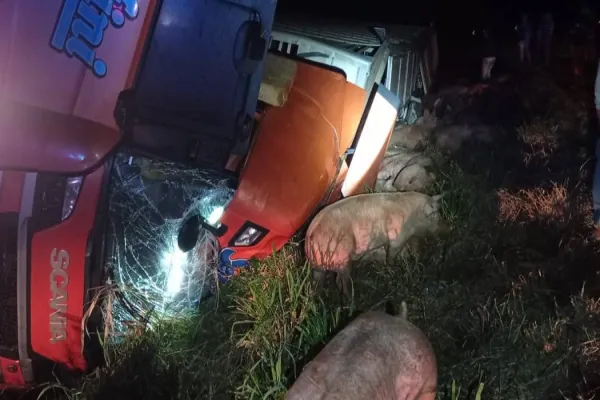 Na noite desta quarta-feira (26/04), um acidente envolvendo um caminhão carregado de suínos aconteceu na BR-163, em Lindoeste.