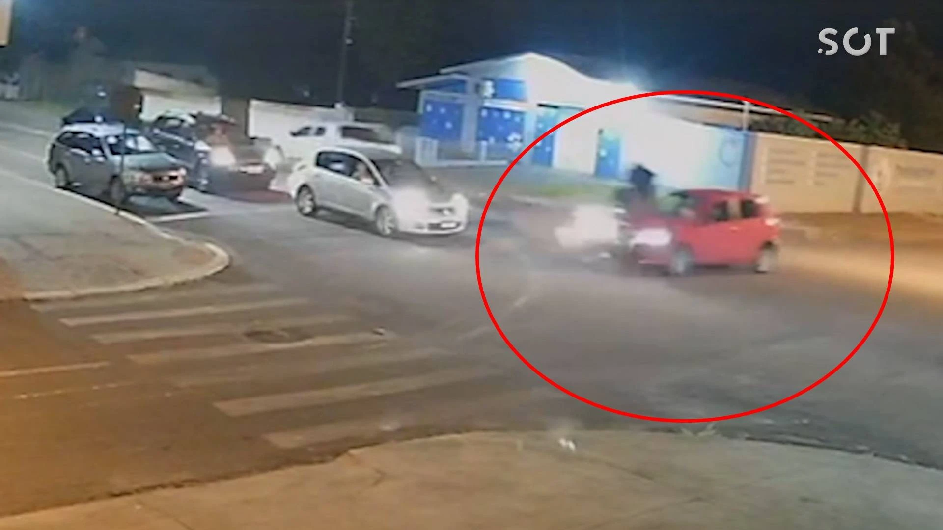 Nas imagens, é possível ver que vários veículos param no cruzamento para atravessar a preferencial, momento em que o motociclista não percebe a movimentação do Fox e cruza a via. Ele e a motocicleta são atingidos em cheio e são arremessados para o meio-fio.
