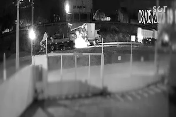Imagens de câmeras de segurança registraram o momento em que os veículos colidiram, deixando o baú do caminhão carregado com frutas completamente retorcido.