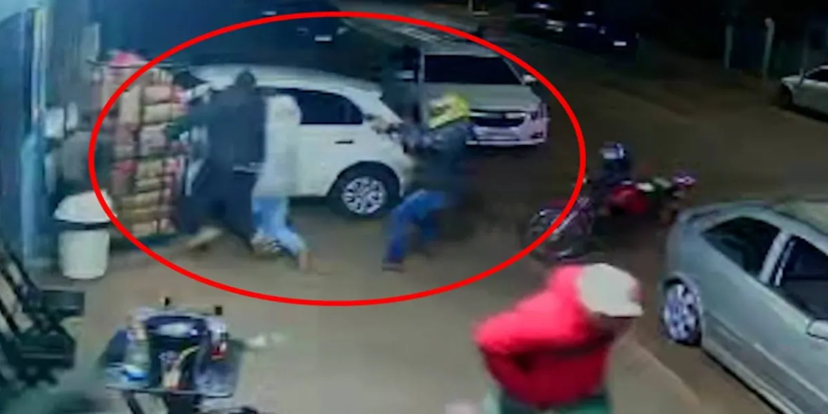 O incidente aconteceu por volta das 2h da madrugada, quando um grupo de pessoas estava em frente ao estabelecimento. Nas imagens da câmera de segurança é possível ver as pessoas conversando e rindo, quando dois homens chegam em uma moto.