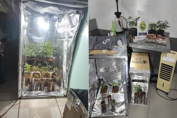 Ao ser questionado sobre a existência de mais drogas na residência, o suspeito admitiu e autorizou a entrada da equipe policial. Durante as buscas, foi encontrada uma estufa caseira contendo 14 plantas de maconha, além de uma porção da mesma substância. A estufa estava montada e preparada para a produção da droga.
