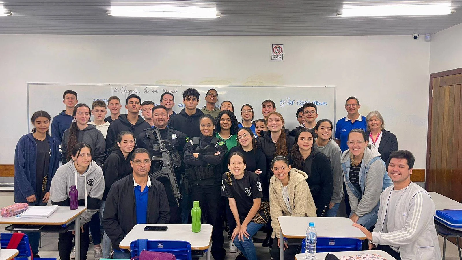 Nesta terça-feira (23/05), a Escola Cívico-Militar Júlia Wanderley, localizada em Cascavel, Paraná, teve a honra de receber a presença da Polícia Penal Federal (PPF) como parte do Projeto Valores - Cidadania e Civismo. A ação, coordenada pela Pedagoga Ednéia Dias Martins, contou com a participação do Diretor Celso Stimer e do Gestor Escolar Capitão Rigotti, proporcionando uma palestra inspiradora para os alunos.