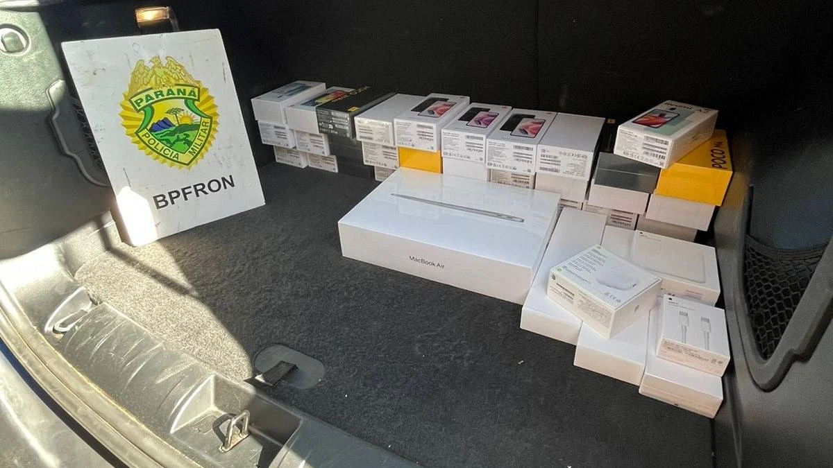 Nele foram encontrados 31 aparelhos celulares e eletrônicos diversos de origem estrangeira além de um revólver e cinco munições. O condutor do veículo foi preso e encaminhado com a arma e munições para a delegacia da Polícia Civil. O veículo e as mercadorias foram encaminhados para a Receita Federal de Cascavel-PR.