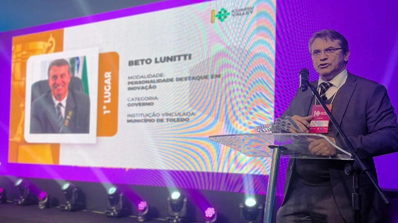 TOLEDO - A administração municipal de Toledo segue conquistando prêmios pelas iniciativas em prol do desenvolvimento econômico. Desta vez, o prefeito Beto Lunitti recebeu o Prêmio Iguassu Valley 2022, na categoria Personalidade Destaque em Inovação - Governo. A entrega do reconhecimento aconteceu na quarta-feira (15), em Foz do Iguaçu, durante a realização do Summit Iguassu Valley, evento com o intuito de apresentar avanços nas áreas de tecnologia e inovação.