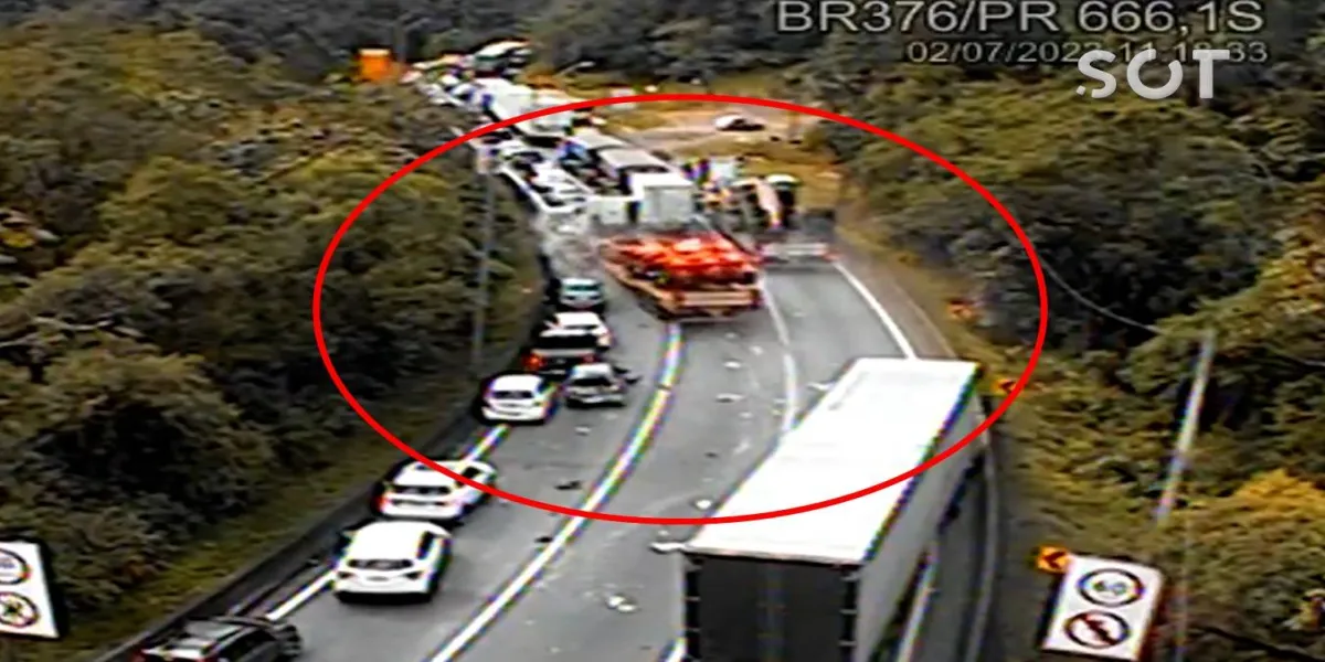 Na manha deste domingo (02/007), um gravíssimo acidente ocorreu na BR-376, resultando na interdição da pista sentido Santa Catarina, no km 666, em Guaratuba, Litoral do Paraná. Imagens de uma câmera de monitoramento capturaram o momento em que uma carreta, que havia perdido os freios durante a descida da serra, colidiu com diversos veículos, causando um engavetamento de proporções impactantes.