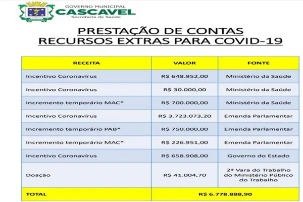 O Secretário de Saúde de Cascavel, Thiago Daross Stefanello, disponibilizou nesta quinta-feira (18) uma prestação de contas exclusiva sobre os recursos que foram recebidos para o enfrentamento ao novo coronavírus. O dinheiro não é exclusivo para Covid-19, no entanto o município optou pelo uso para este fim, conforme recomendação do Ministério da Saúde.