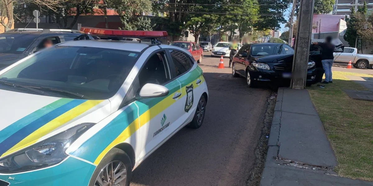 Mulher é socorrida após colidir veiculo em poste de iluminação no Centro de Cascavel