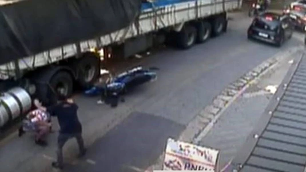 As cenas chocantes mostram o motociclista, após a queda, ficando embaixo da carreta por alguns instantes...