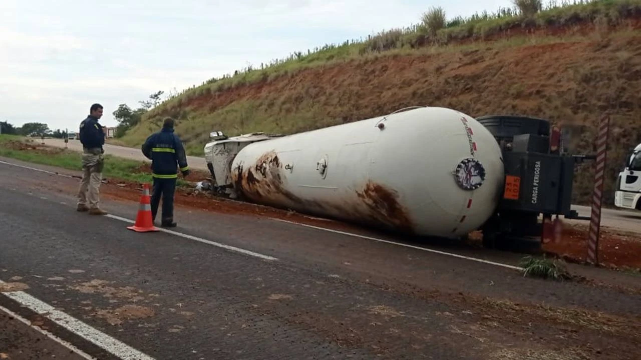 Tombamento de carreta com GLP interdita BR-163 entre Santa Lúcia e Lindoeste