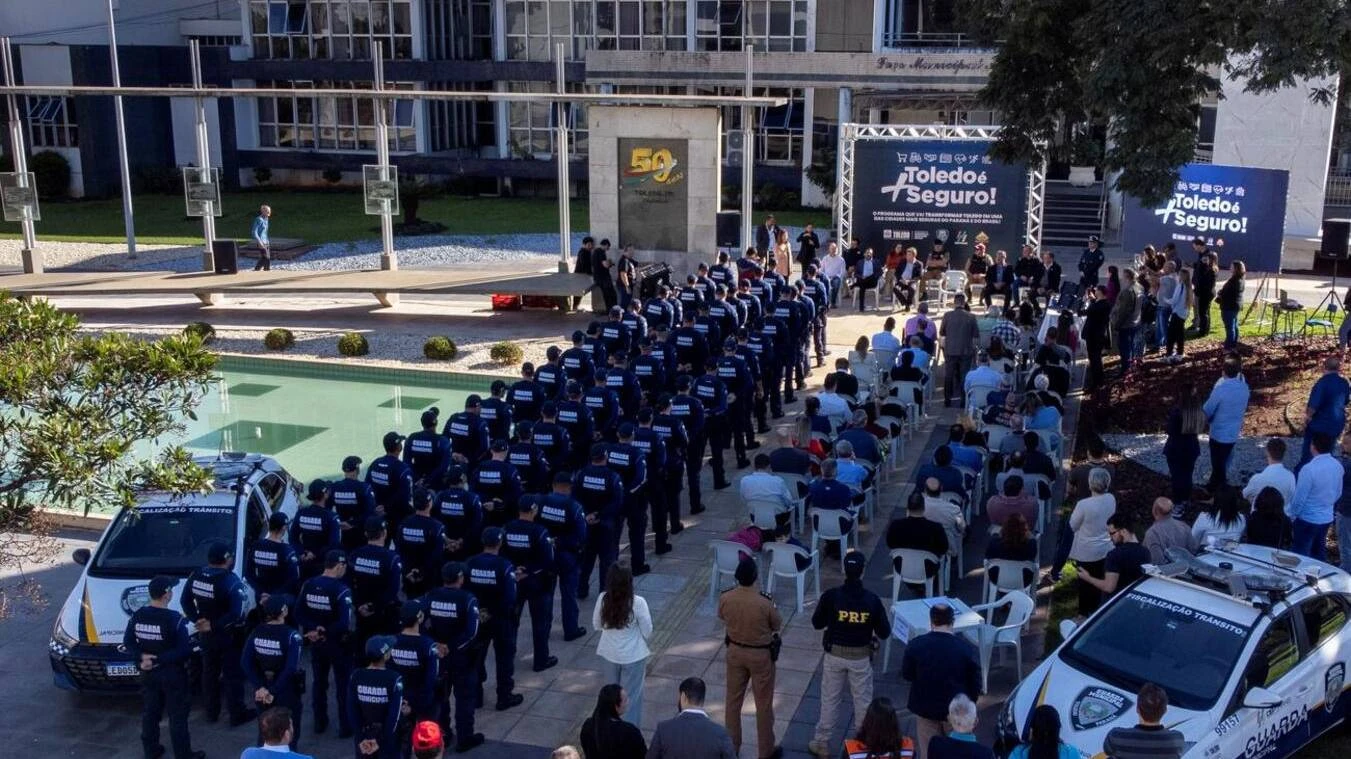 Em uma solenidade memorável realizada nesta segunda-feira, 31 de julho de 2023, a Guarda Municipal de Toledo marcou sua história ao lançar o programa "Toledo é + Seguro!". O evento, que aconteceu em frente ao Paço Municipal Alcides Donin, contou com a entrega oficial de armamento de fogo a 47 integrantes da corporação que participaram e foram aprovados em um treinamento rigoroso de 660 horas. Além disso, durante a cerimônia, foram ativadas as primeiras câmeras particulares na Central de Videomonitoramento da GM, que agora tem capacidade operacional para até 1.000 unidades simultâneas.