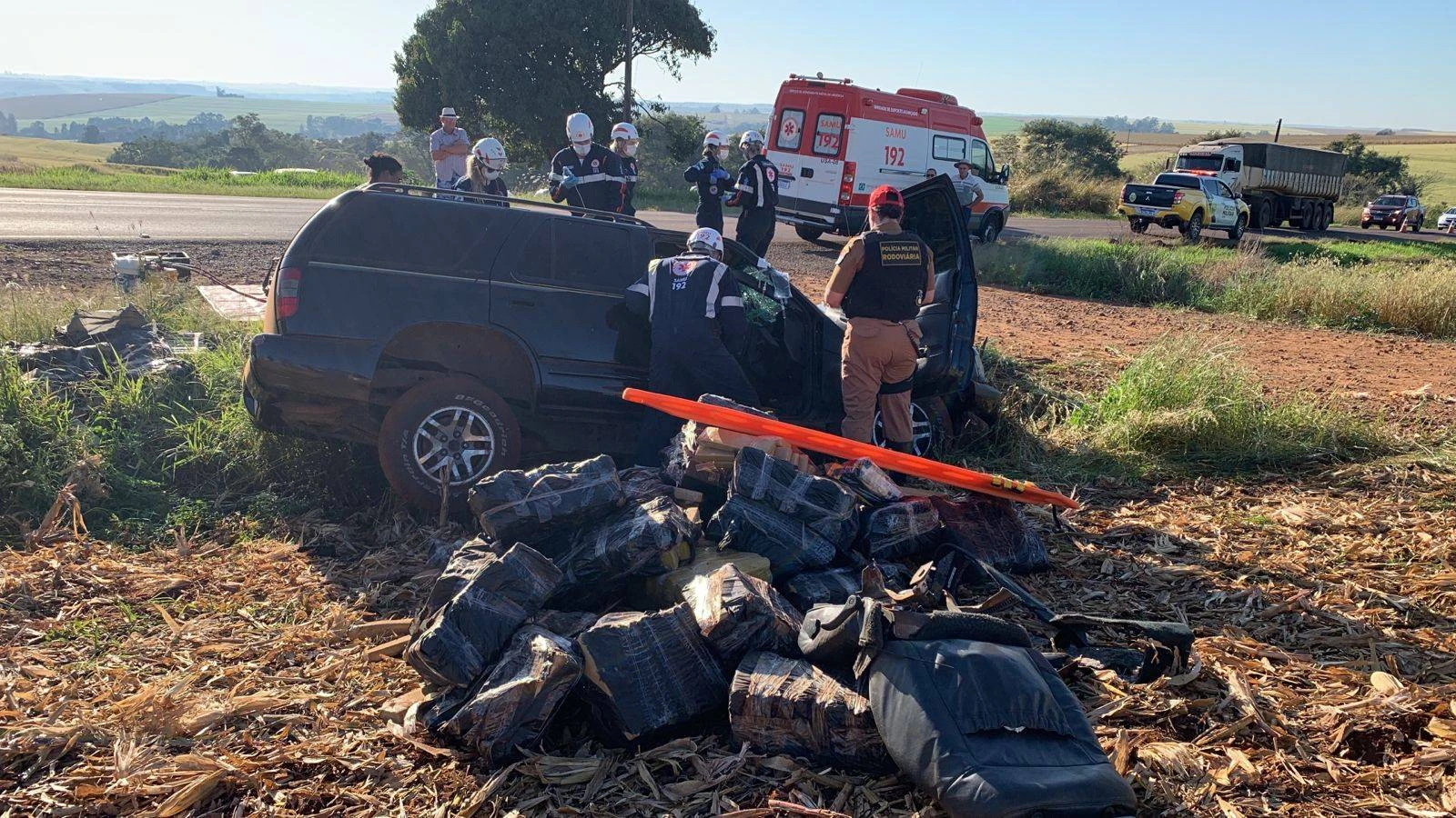 Os entorpecentes estavam dentro de uma Blazer, que capotou e parou às margens da rodovia. O motorista ficou preso às ferragens e precisou de socorro. Uma equipe do Serviço de Atendimento Móvel de Urgência (SAMU) de Cascavel e do SAMU de Santa Helena estiveram no local.