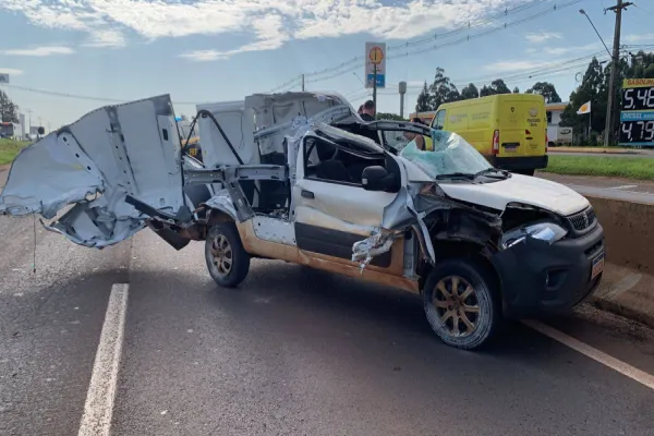 Fiorino fica totalmente destruída após forte batida contra caminhão na BR-277, em Cascavel