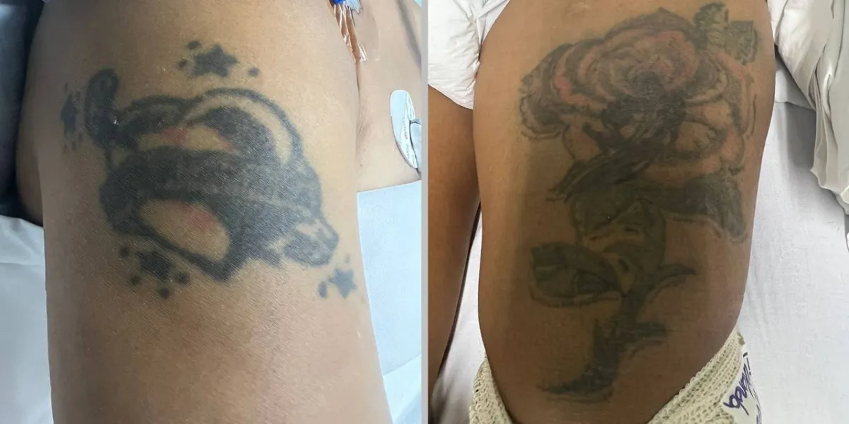 A mulher é negra, magra, aproximadamente 44 anos e possui duas tatuagens sendo um coração com quatro estrelas no braço direito e outra de uma rosa grande na coxa esquerda.