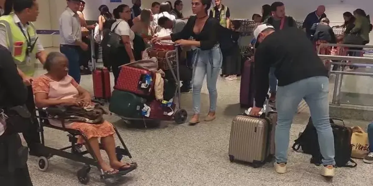Todos os passageiros tiveram que retornar ao saguão do aeroporto. O voo precisou ser remarcado para esta segunda-feira.