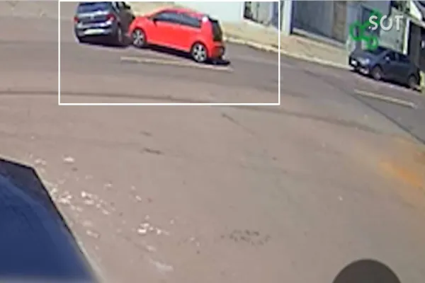Imagens de uma câmera de monitoramento registraram o momento em que um veículo Gol capotou após se envolver em uma colisão com um UP, na tarde desta quarta-feira (30/08), no cruzamento da rua Castro Alves com a rua Natal, no Centro de Cascavel.