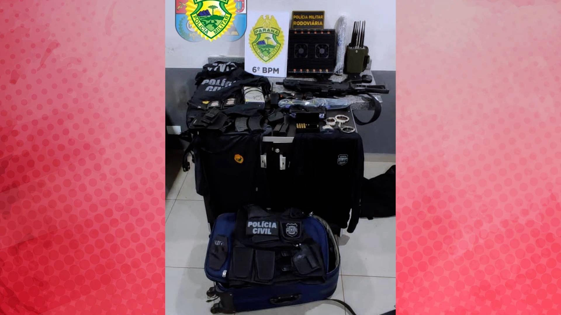 Durante a abordagem, os policiais encontraram uma mala de viagem no interior do veículo. Dentro dessa mala estavam diversos equipamentos, incluindo: