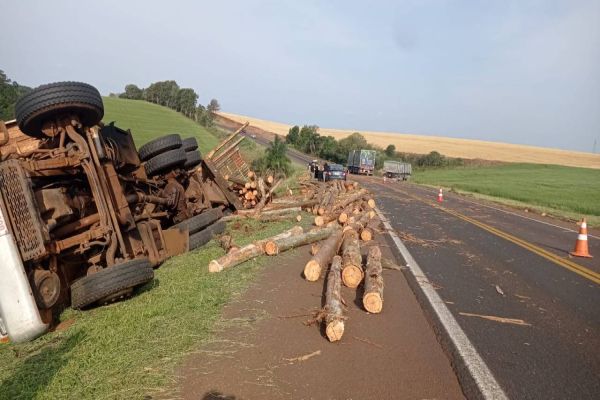 Caminhão carregado com toras tomba sobre a BR-277 após acidente com veículo de passeio