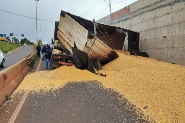 Carreta tomba no Trevo Cataratas por excesso de peso e fora de condições de trafegar, diz PRF