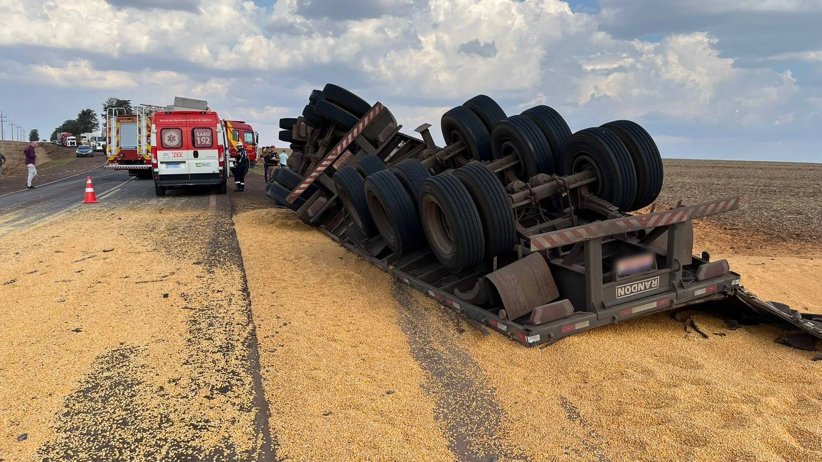 Um grave acidente de trânsito foi registrado na tarde desta quarta-feira (20/09), quando uma carreta carregada de cereais tombou na rodovia PR-182, entre o trevo de Maripá e a empresa Cassava.