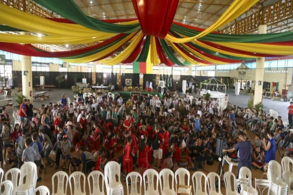 Ao chegarem no Centro de Eventos, os alunos são recebidos com uma contação de história realizada por meio do projeto Biblio Sesc (um caminhão adaptado vira uma biblioteca móvel, são três percorrendo o Estado do Paraná para reforçar o trabalho dos professores com a leitura). A anfitriã inicia cada atividade com a poesia “Orgulho Gaúcho” da poetisa e escritora Inoema Nunes Jahnke, que em palavras faz uma homenagem ao Rio Grande do Sul.