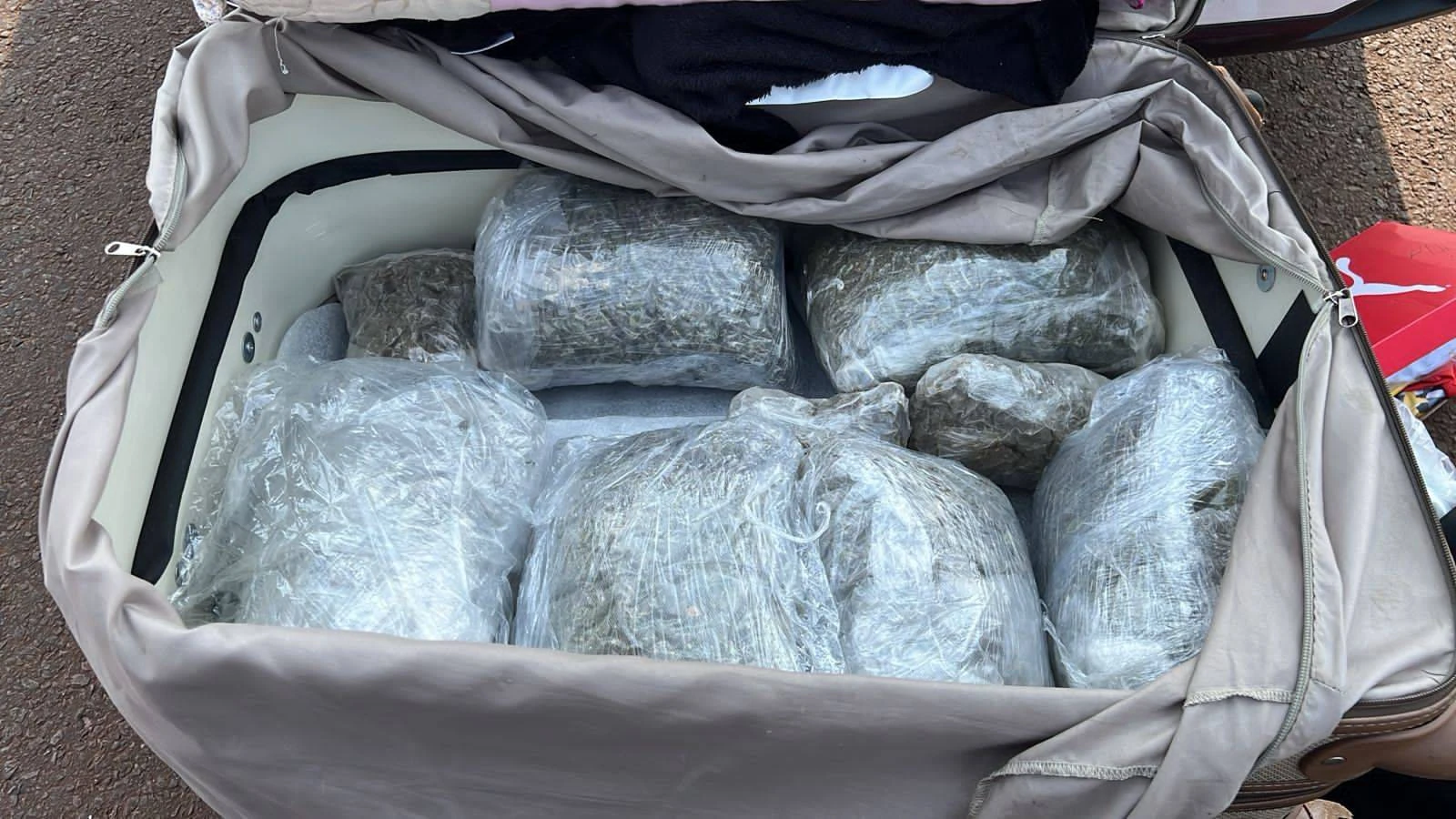 Durante revista, uma passageira de um ônibus que fazia a linha Foz do Iguaçu/PR - São Paulo/SP chamou a atenção da equipe de fiscalização. Com ela foram encontrados na sua bagagem, 19,52 kg de substância análoga à maconha.