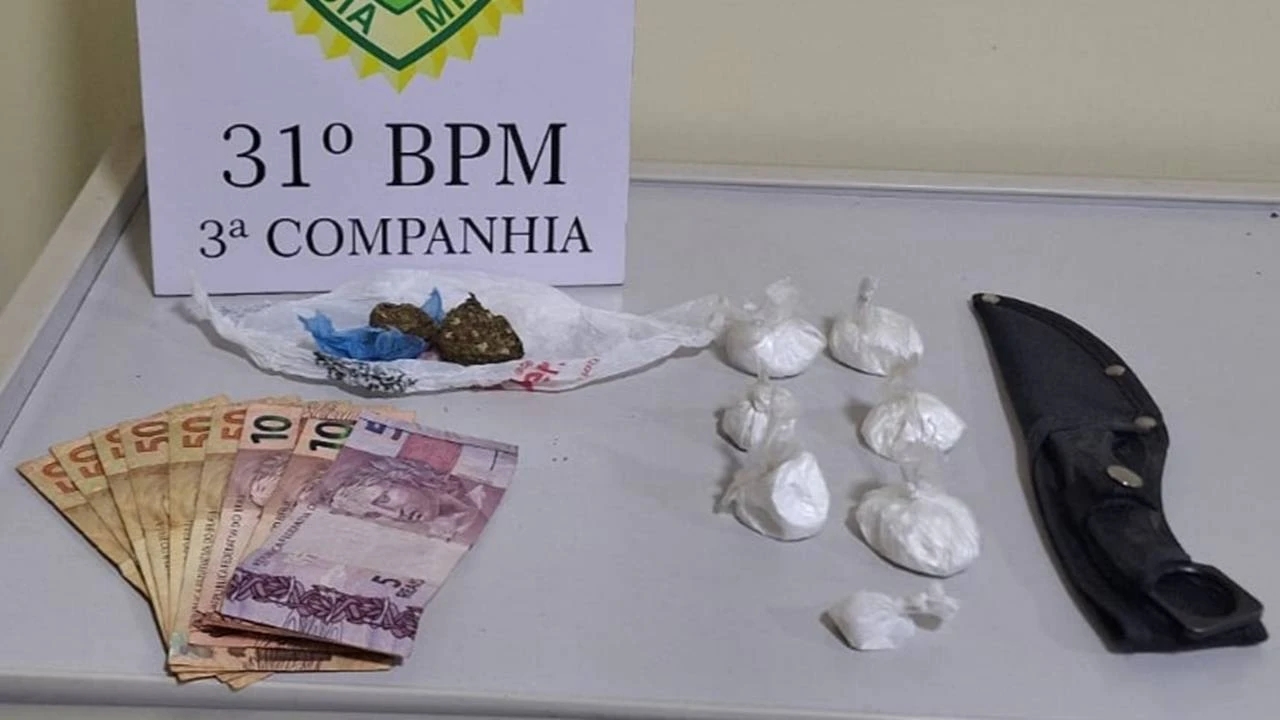 Após buscas no local, a sacola dispensada pelo suspeito foi encontrada, contendo invólucros identificados como buchas de uma substância análoga à cocaína, além de uma faca de cor preta com lâmina de 10 cm. O suspeito foi preso e o veículo estacionado próximo a ele foi revistado, resultando na apreensão de duas porções de uma substância análoga à maconha.