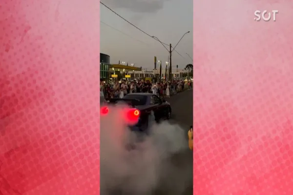 O condutor de um Nissan Skyline fez um “borrachão” em plena via pública, na Avenida Rocha Pombo, em frente às viaturas da PM que se encontravam em torno do evento.