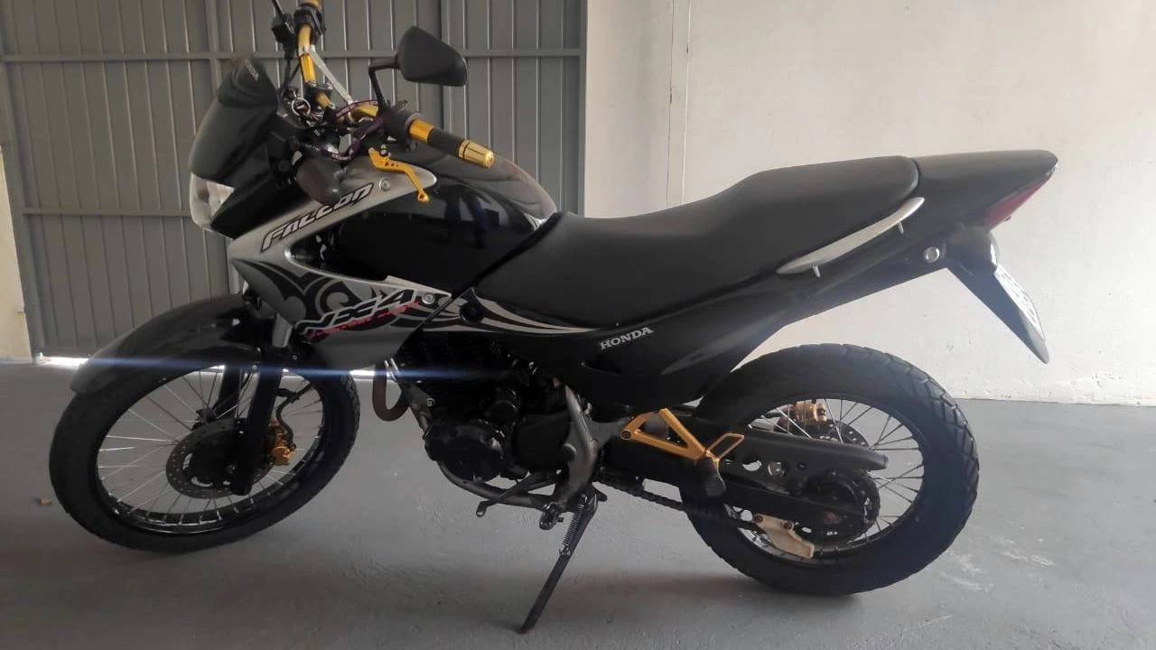 A motocicleta é uma Honda Falcon NX400 é no ano 2006, cor preta, com placa de Toledo (ANL 4C48)...