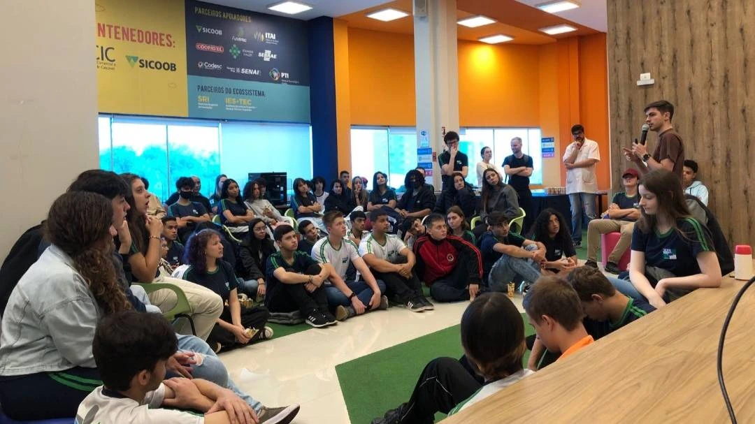 Os alunos acompanharam também o depoimento do sócio da Edubot, uma das startups incubadas na AcicLabs e egresso do CEEP, Vinícius Stanoga. Ele falou de seu período como estudante na instituição e da experiência de participar de uma startup de sucesso, que desenvolve materiais pedagógicos que já estão em escolas de várias regiões do País.